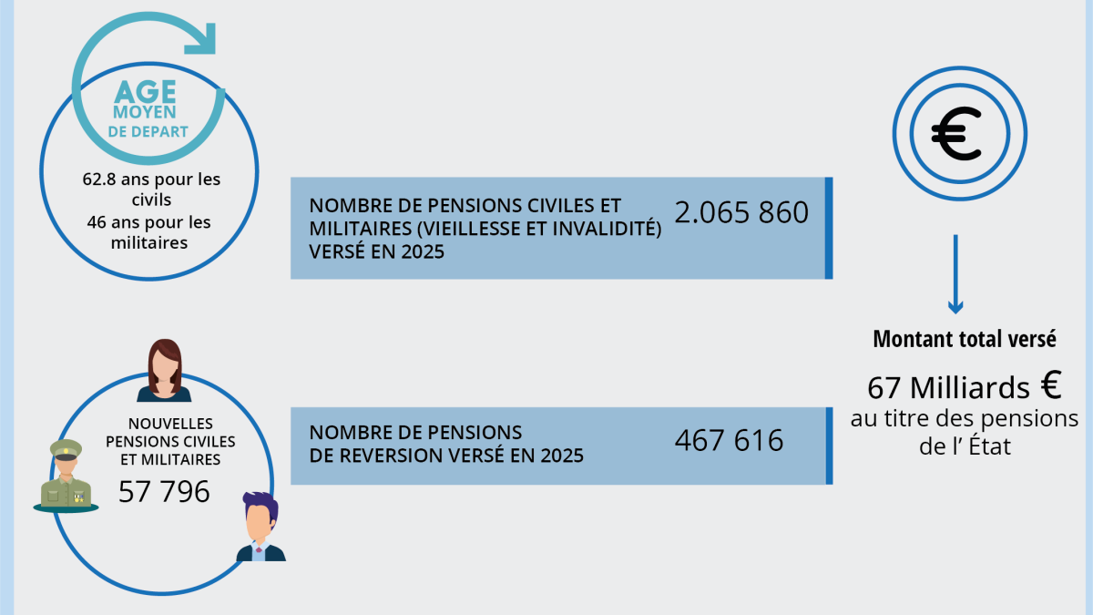 • L'âge moyen de départ a la retraite en 2025 est de 62,8 ans pour les agents civils et de 46 ans pour les militaires